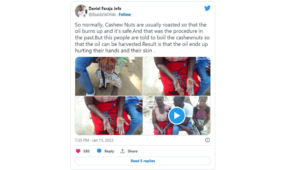 Bàn tay của họ sần sùi, phồng rộp và sưng tấy. Những người đàn ông và phụ nữ chế biến hạt điều ở Kilifi, Kenya sử dụng đôi bàn tay đau nhức này để cẩn thận tách hạt thô ra khỏi quả và vỏ điều. Nhiều người làm việc không có máy móc, thiết bị bảo hộ phải tránh tiếp xúc với chất lỏng cay xè tiết ra từ vỏ điều. Những bức ảnh cho thấy bàn tay của công nhân hạt điều đã được đăng trên Twitter vào ngày 15 tháng 1, tạo nên làn sóng ở Kenya trong bối cảnh kêu gọi cải cách. Chính quyền địa phương đã bắt đầu kiểm tra các cơ sở sản xuất hạt điều, thậm chí đóng cửa một số cơ sở cho đến khi cơ sở đó khắc phục các hoạt động của mình.