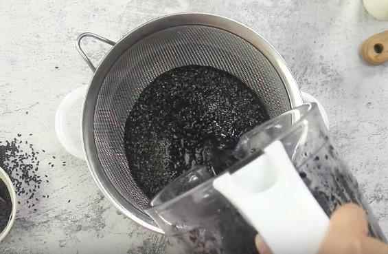 • Bước 3: Đổ hỗn hợp nước đó vào nồi đun với lửa nhỏ, vớt bọt ra liên tục. Sau 5 phút nấu, thêm muối, mạch nha vào. Đun thêm 10 phút nữa là xong món sữa hạt điều mè đen rồi.